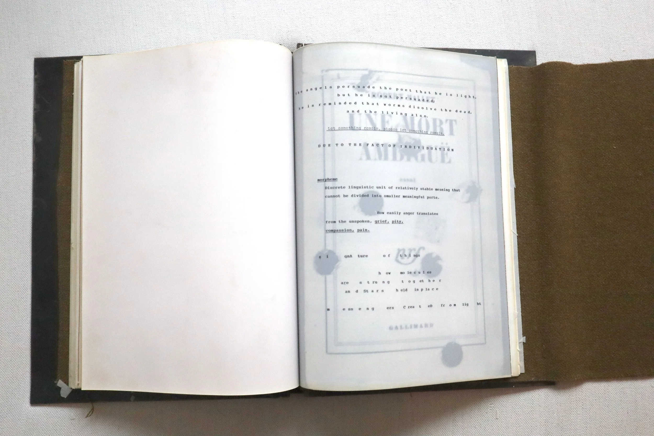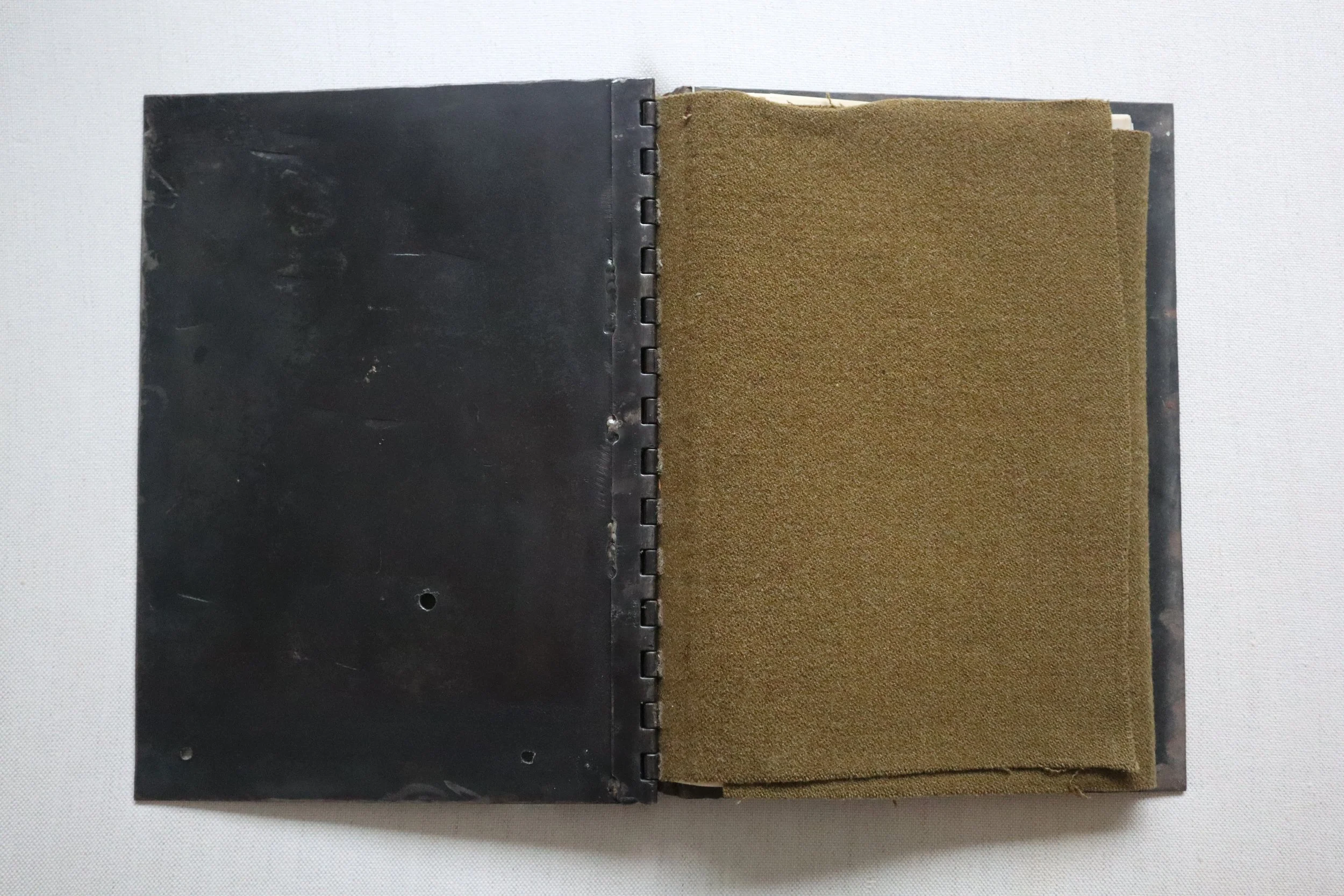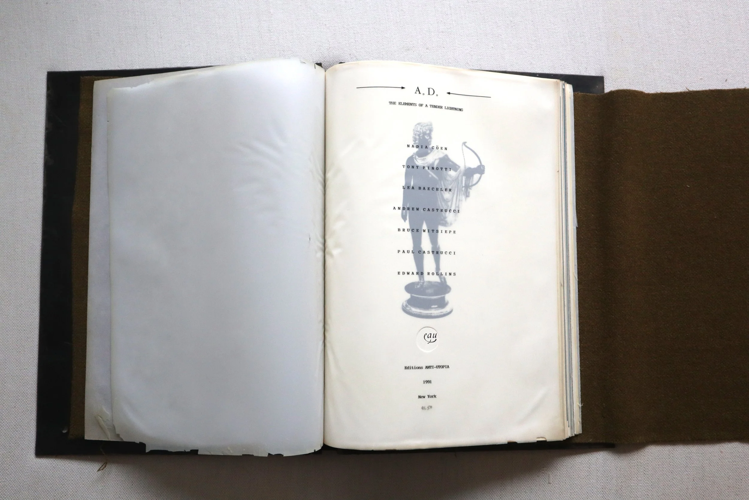 A.D. is a 200-page volume especially produced for an exhibition curated by Nancy Spero at Franklin Furnace. It combines typewritten text on vellum and mylar, diagrams, and Xerox images, bound in a forged steel cover with a piano hinge and an army blanket lining (12 × 17 in.)