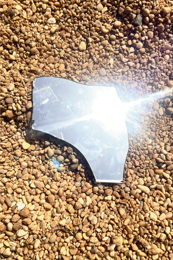 Radio the Sun is a body of interdisciplinary works created during a residency in Andalusia, Spain. This multidisciplinary installation explores land and grid mapping systems using mirror shards that draw in and reflect light. Through gestures of placement and removal, the body becomes a conduit for tracing energy, memory, and movement. The resulting film vignettes reveal abstractions of deliberate light use, offering portals into ritualistic acts that document action rather than performance. (see video below)