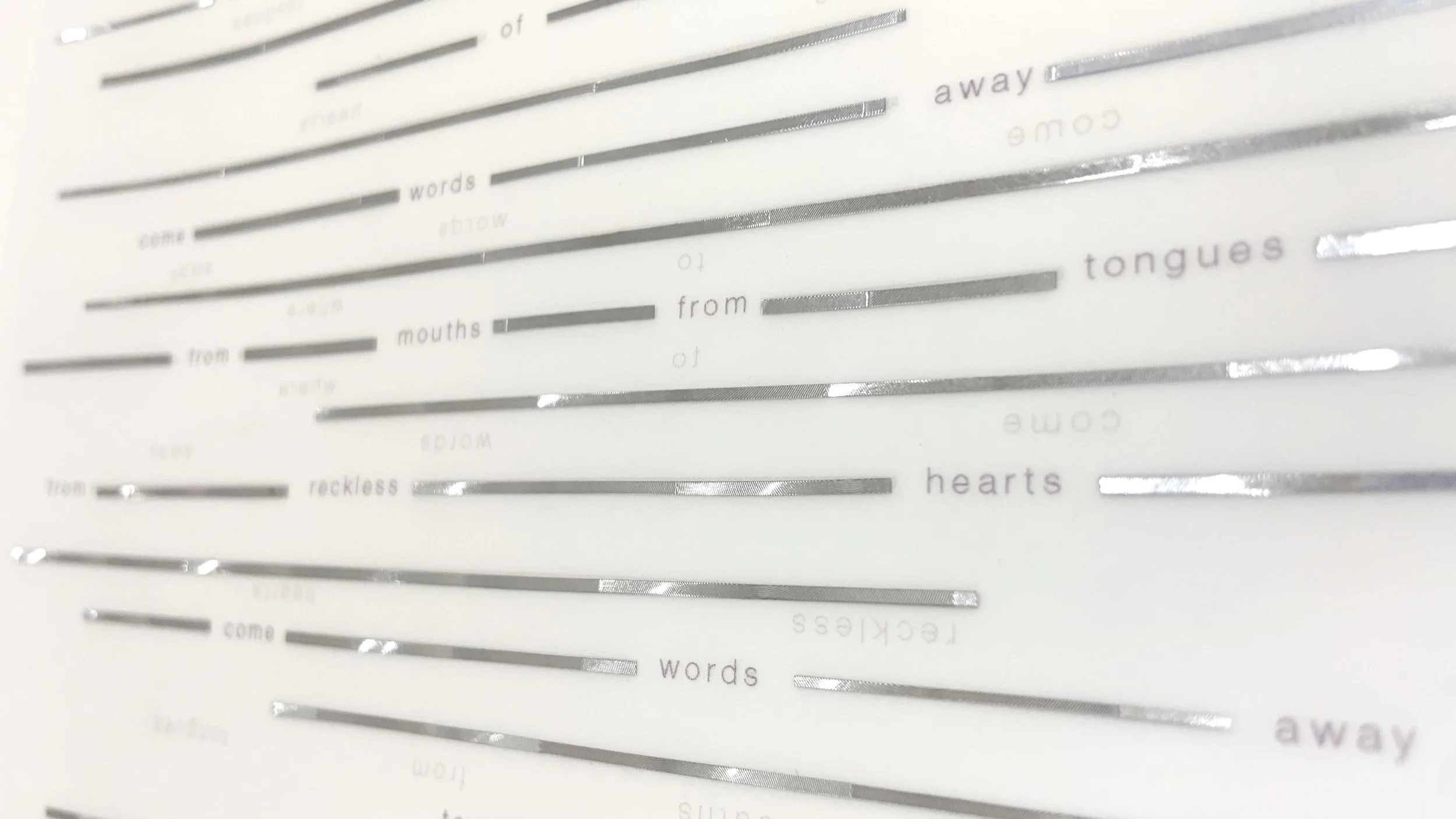 These works on vellum form part of an ongoing series of hand-cut drawings using reflective mylar on drafting vellum. Merging drawing, text, and light, they explore reflection, deflection, illumination, and transparency. Replacing the traditional lead of a pencil with cut reflective mylar, each work is executed entirely by hand, embracing a combination of precision and imperfection.
